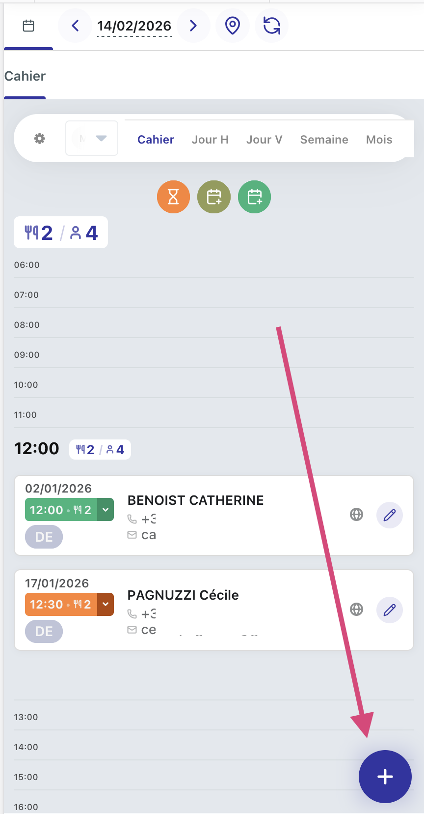 Pour ajouter une réservation, cliquez sur le bouton "+" en bas à droite