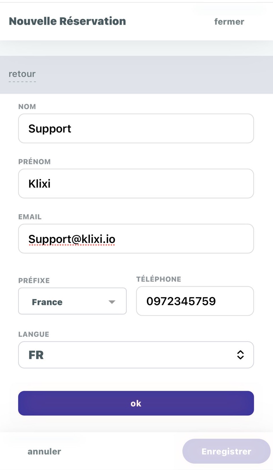 Cliquez enfin sur "ok"pour valider le contact PUIS sur "enregistrer" pour ajouter la réservation.