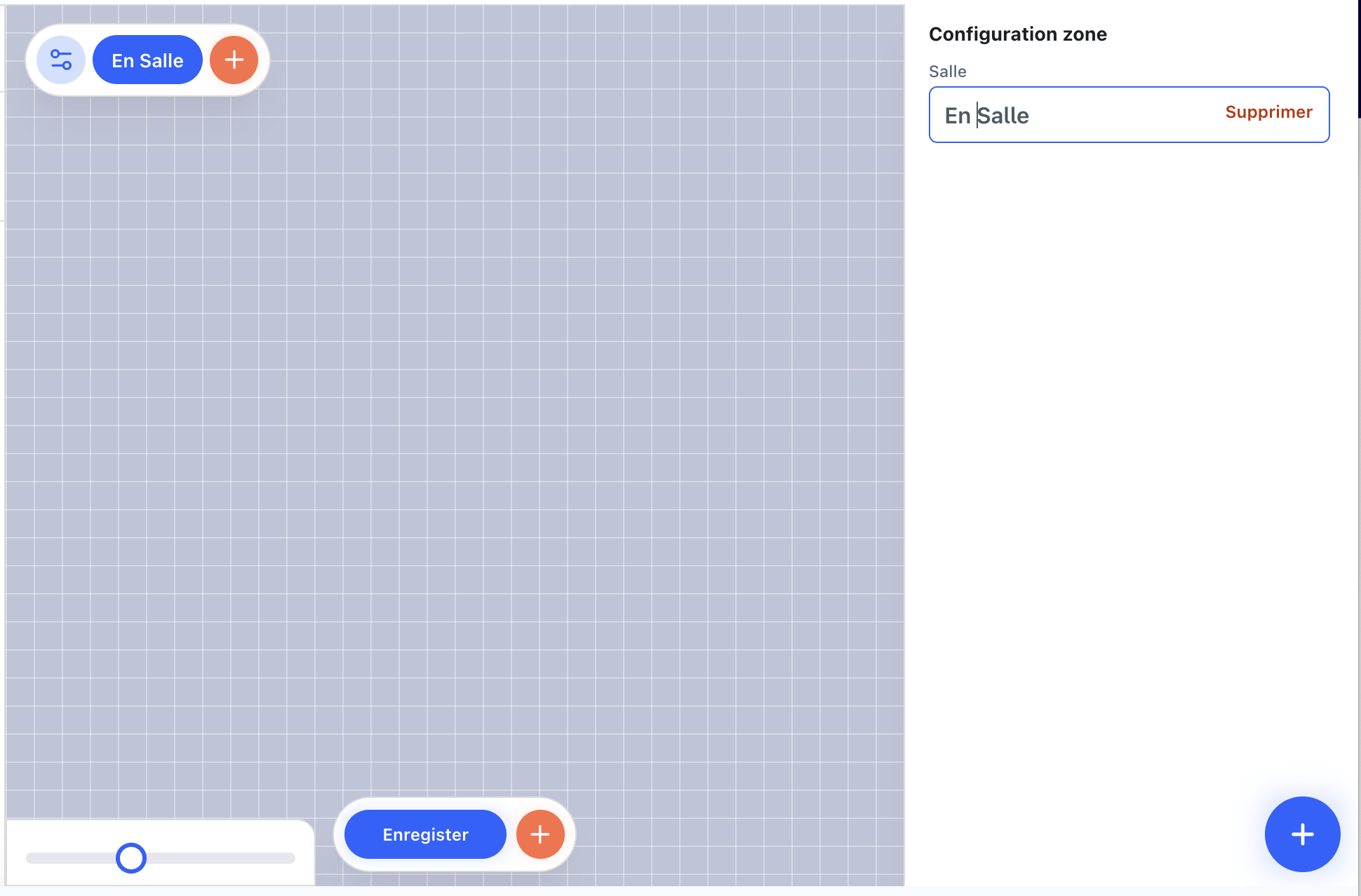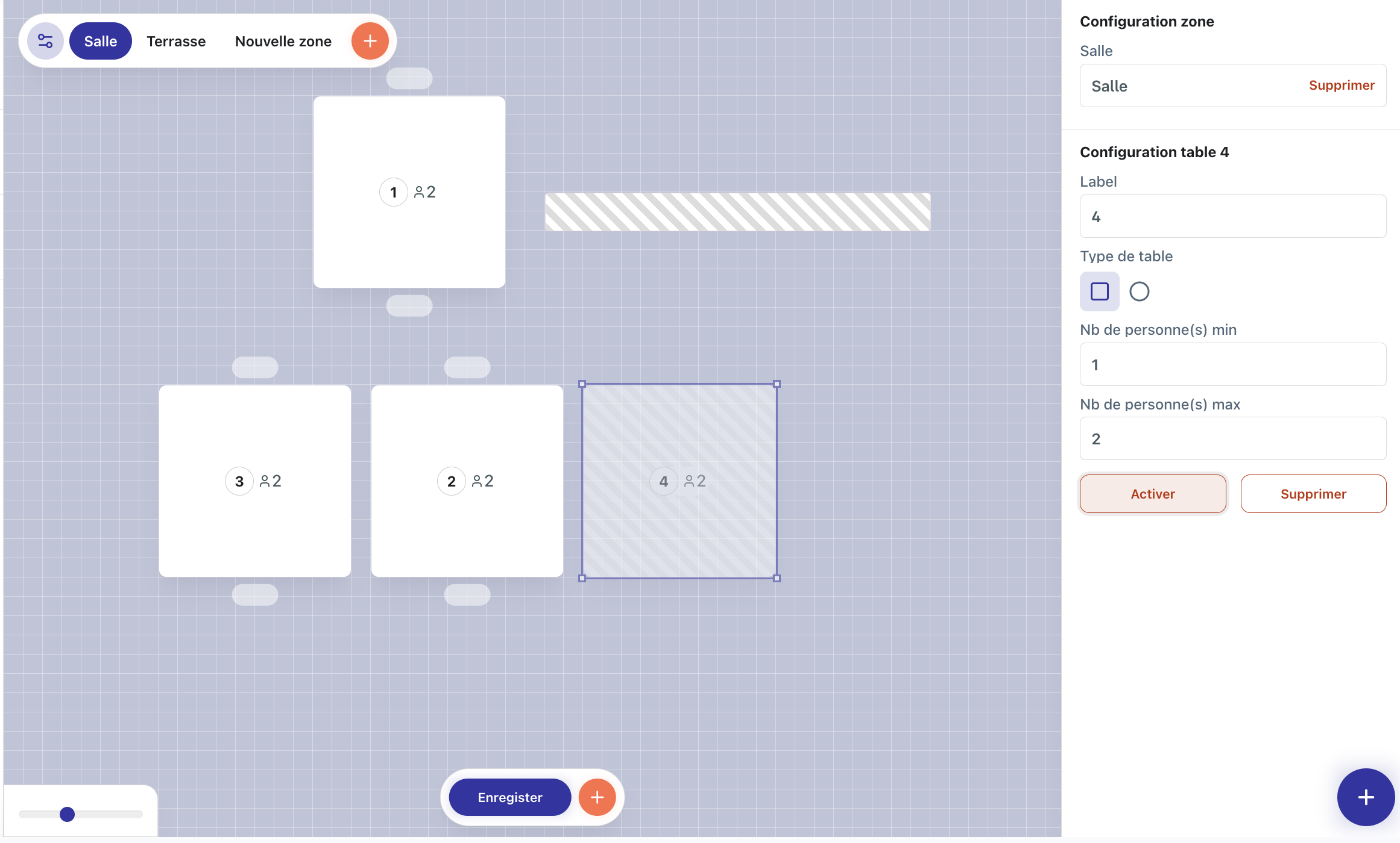 Pour commencer, vus devez créer vos zones (salle 1, salle 2, terrasse, patio ..) pour ensuite leur ajouter des tables.