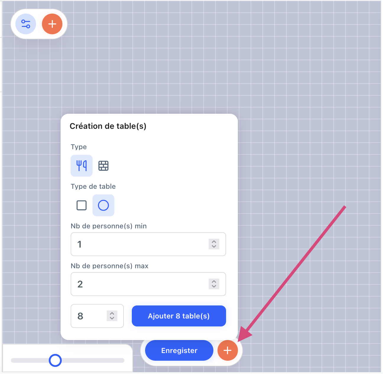 Vous pouvez indiquer si les tables sont carrées ou rondes.