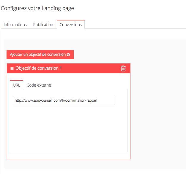 Enfin dans l'onglet "conversion", vous devez indiquez sur quel page va atterrir votre internaute si il fait une action (comme remplir un formulaire).