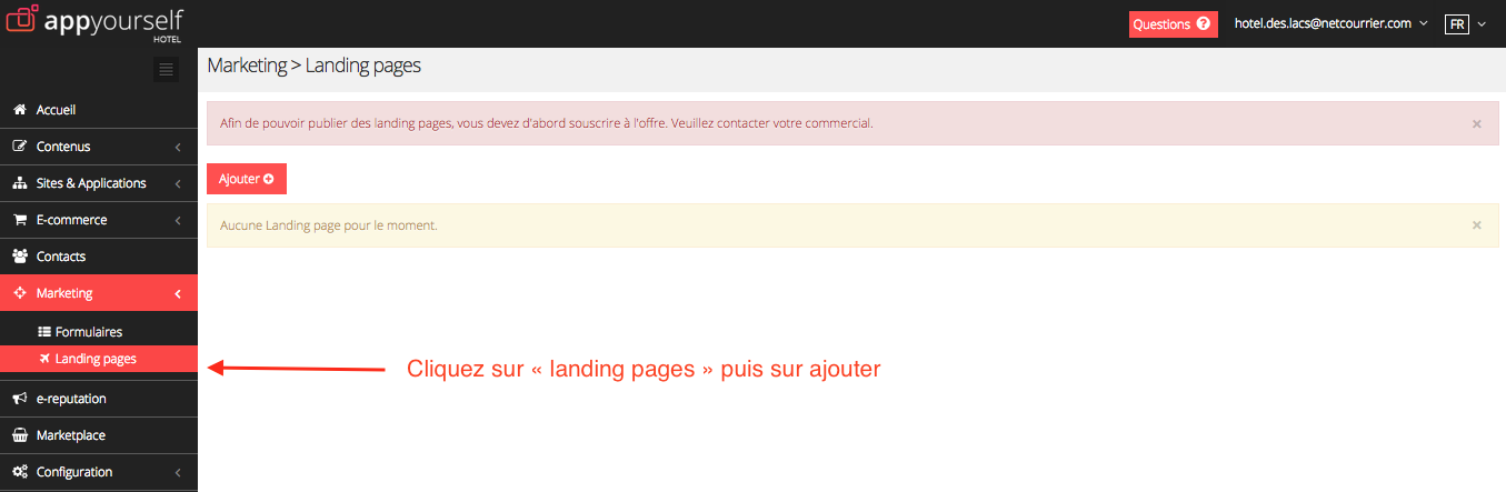 Pour créer une landing page, connectez vous à votre interface appyourself puis dans le menu "Marketing. Sélectionnez "landing pages"