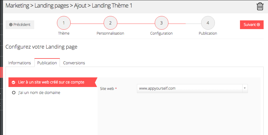 Dans l'onglet "publication", vous devez indiquer à quel site votre landing page va être reliée.