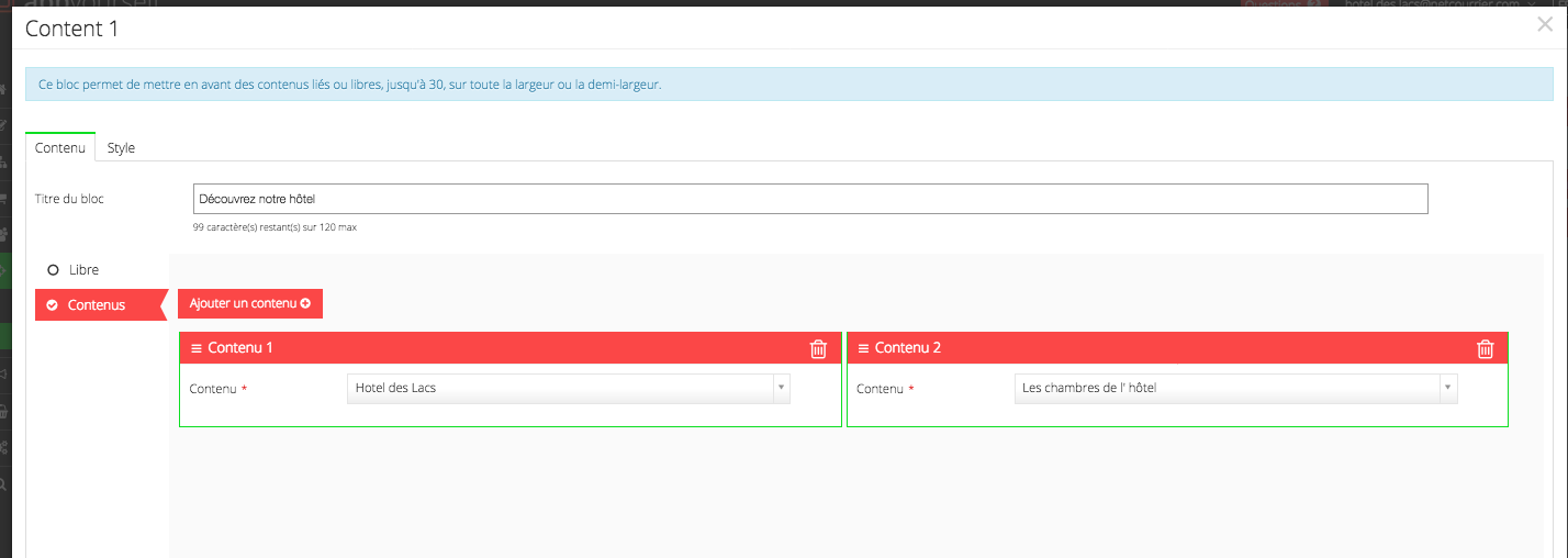 Prenons un exemple. Je choisi de mettre en avant des contenus avec le bloc "content 1.