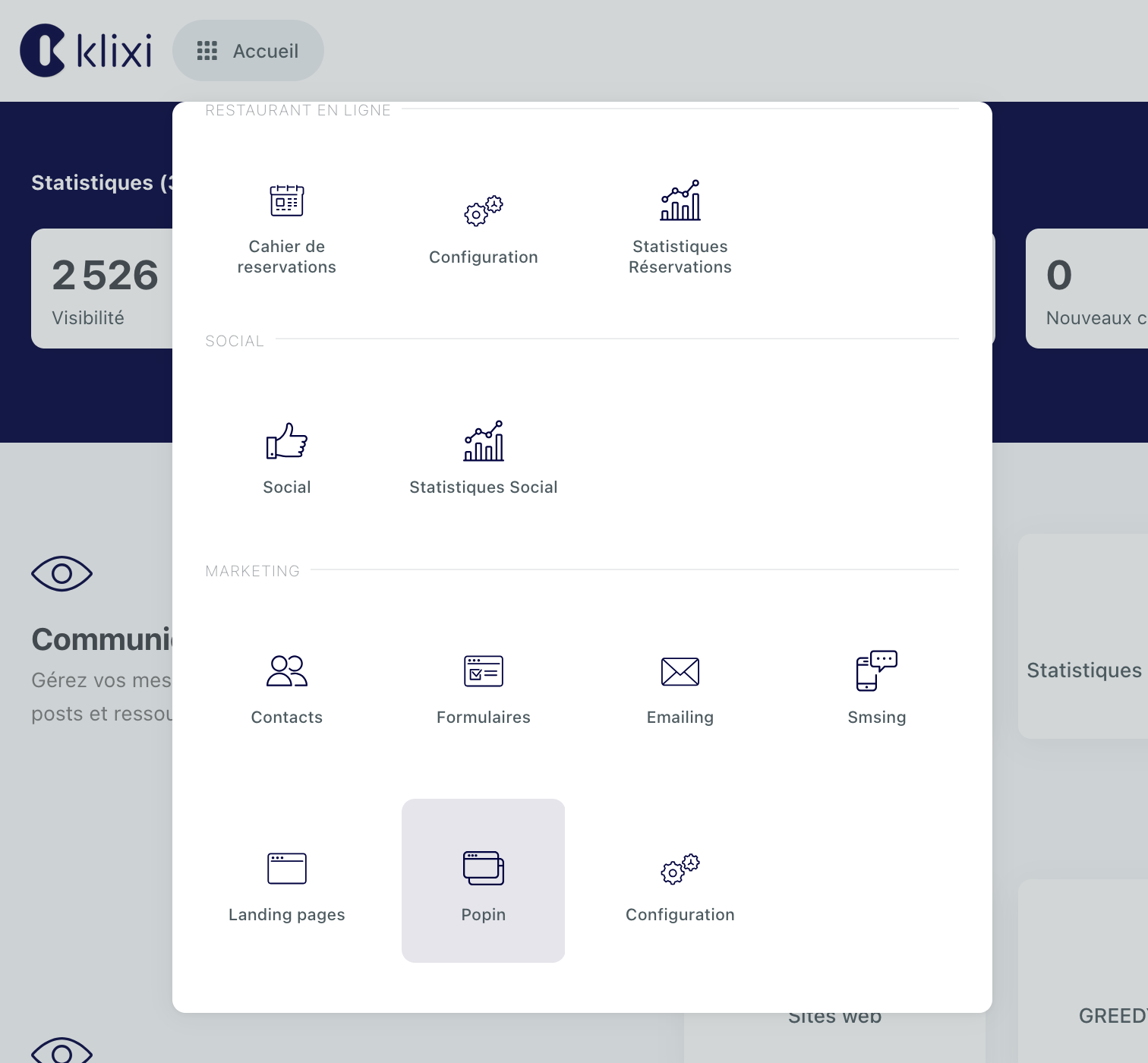 Dans le menu principal, allez dans la partie "marketing" et cliquez sur "popin"