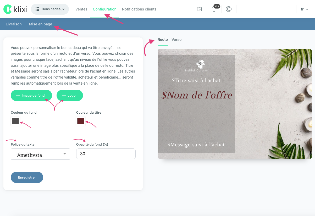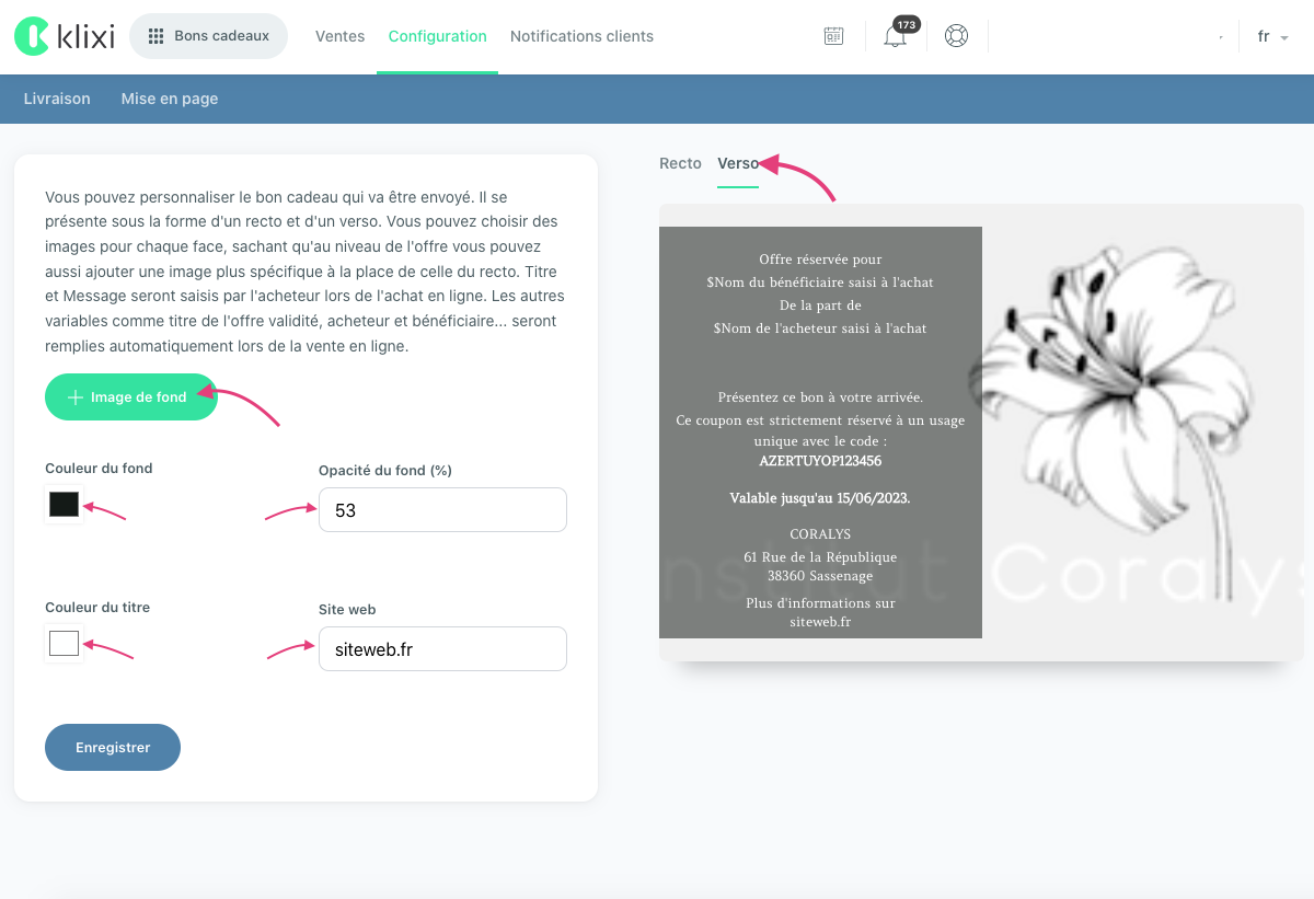 Vous pourrez alors personnaliser les éléments présents sur le recto et le verso des bons cadeaux.