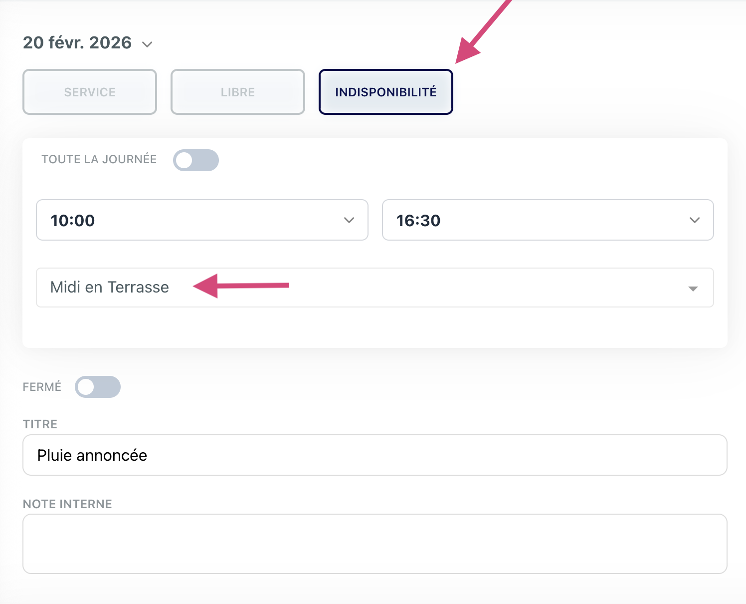 Dans notre exemple, nous allons fermer le service "midi en terrasse" ce soir afin d'éviter les réservations dehors puisque que la pluie est annoncée.