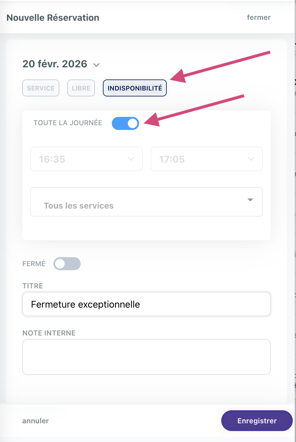 Si la fermeture est sur la journée complète, cochez "toute la journée".