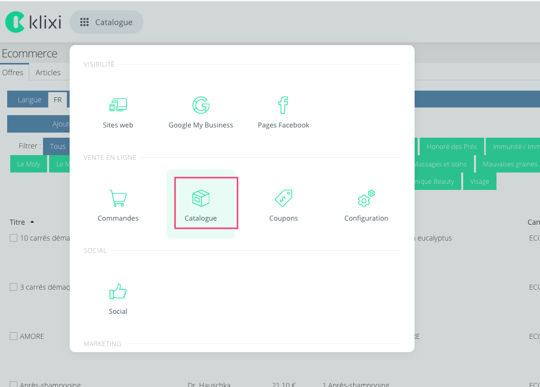 - si c'est un produit e-commerce, sélectionnez le menu "vente en ligne > catalogue ".