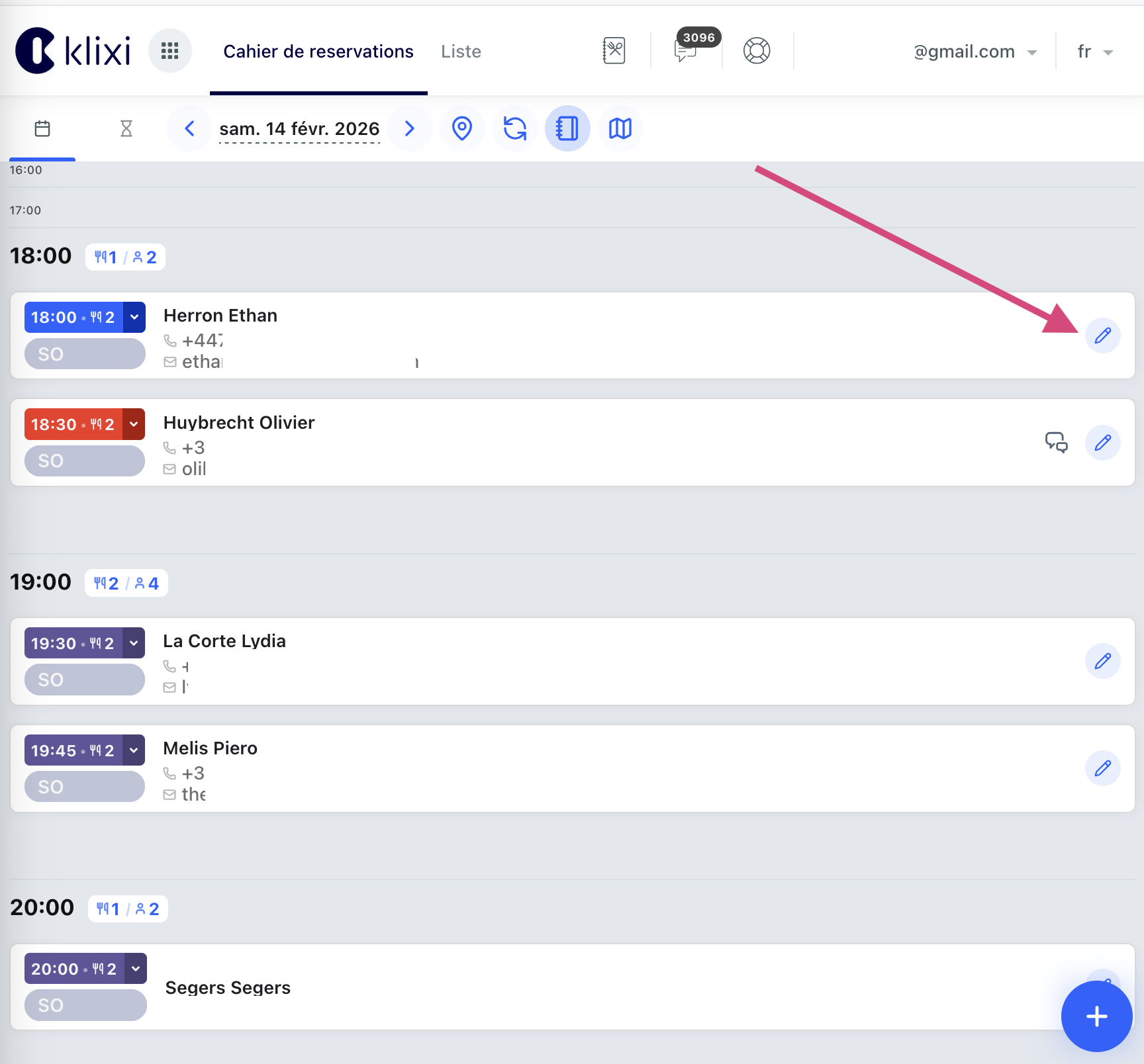 Il suffit de cliquer sur la réservation ou dans la vue cahier de cliquer sur le crayon à droite de la réservation