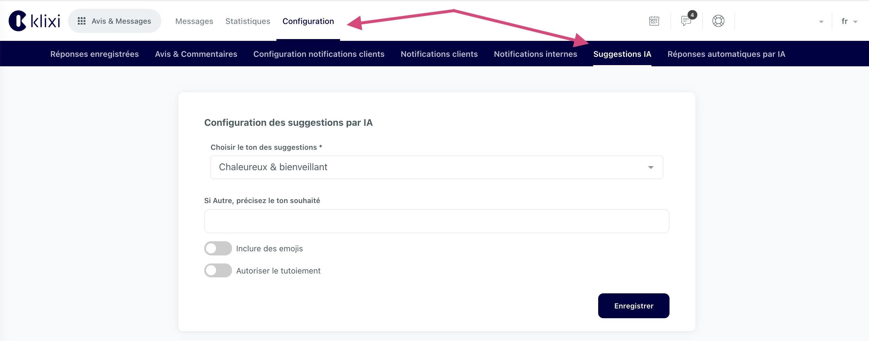 Cliquez ensuite sur l'onglet "configuration" puis sur "suggestion IA".