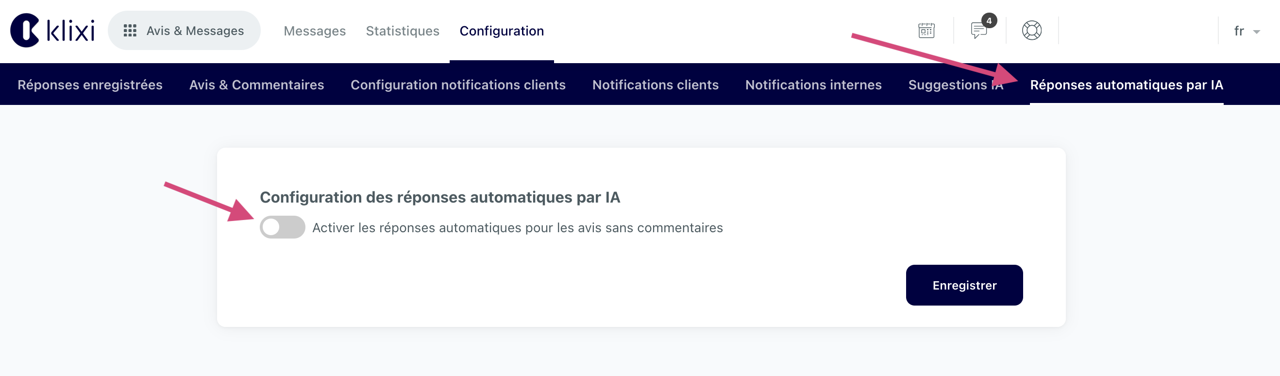 /!\ ATTENTION Nous vous suggérons dans un premier temps de vérifier sur plusieurs avis que les propositions faites par l'IA vous conviennent avant d'activer cette fonctionnalité.