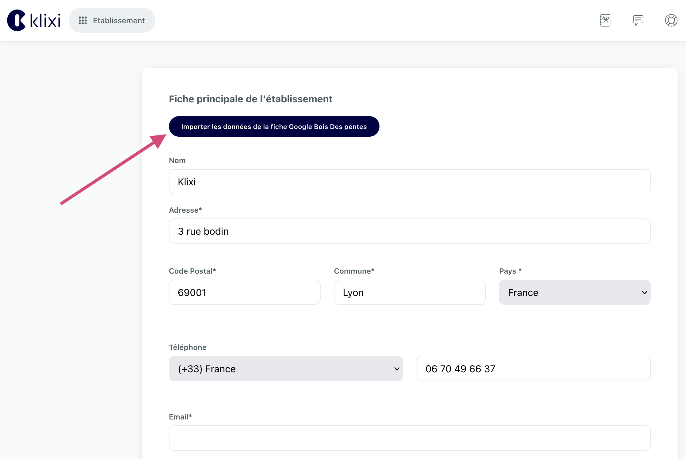 2 - Soit lier votre Fiche Google et utiliser ses informations pour remplir votre établissement.