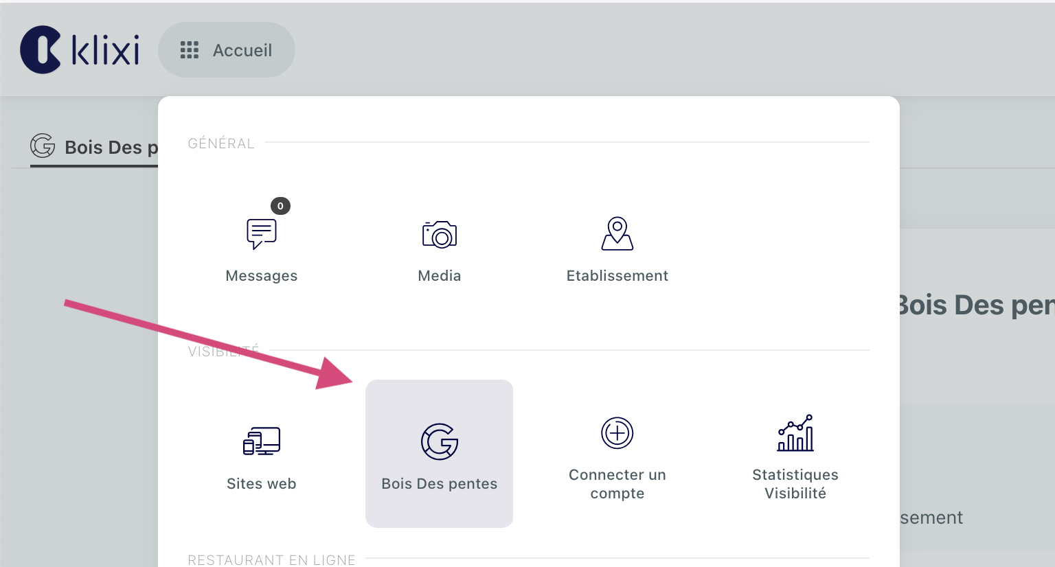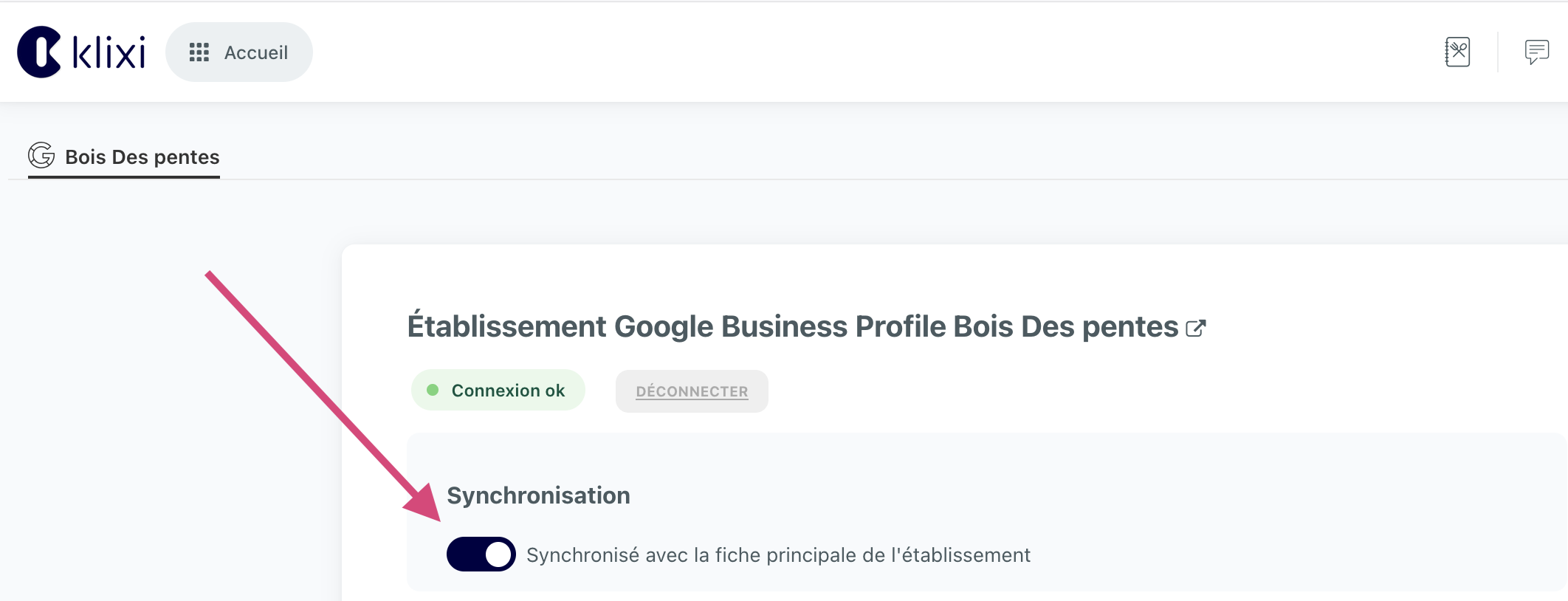3- Synchroniser la fiche établissement, Facebook et Google BusinessRetournez sur votre fiche Google et cliquez l'option "synchronisé avec la fiche principale de l'établissement"